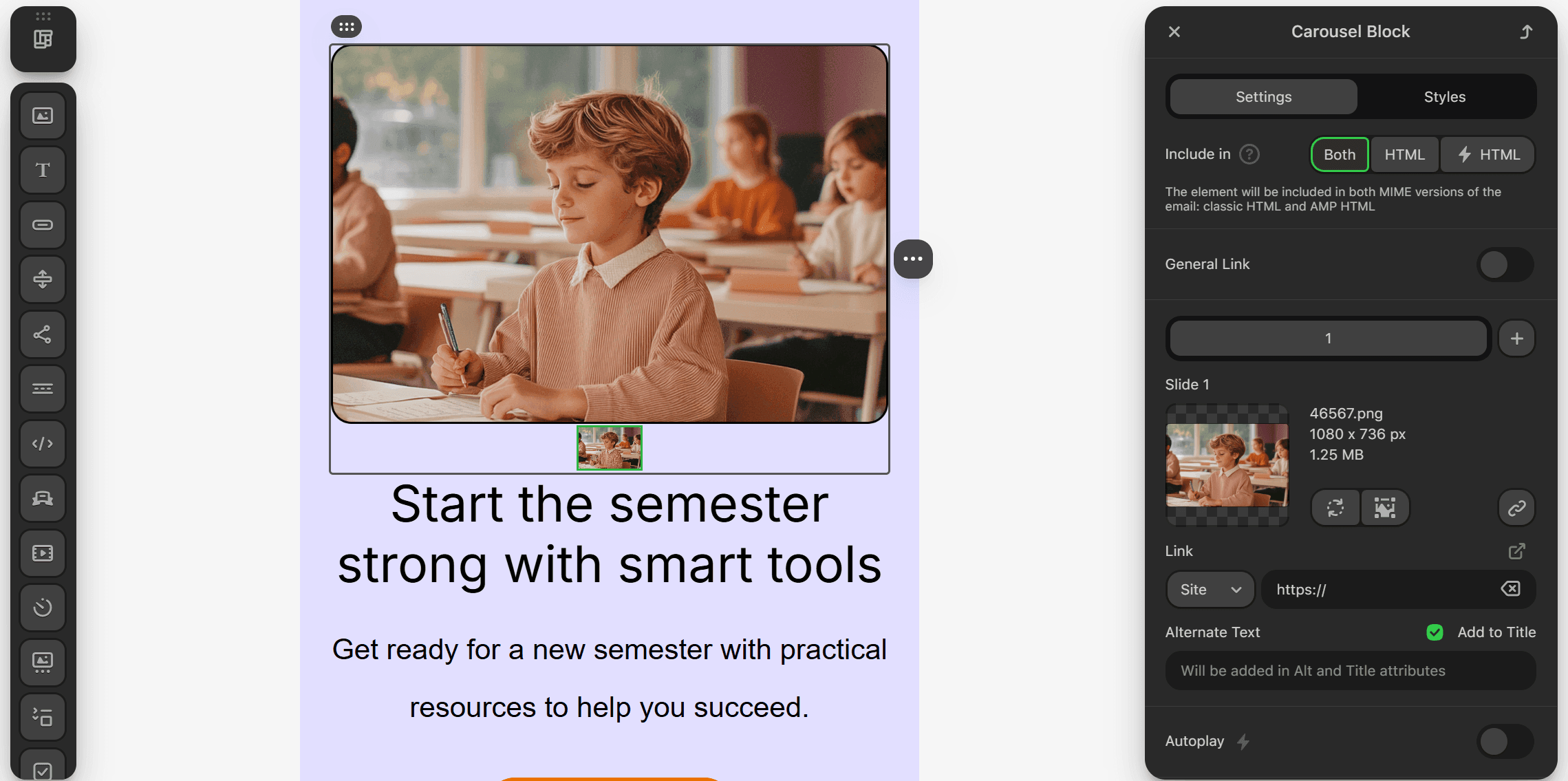 But what if you need to change, for example, the formatting of headings or buttons? This is where the Styles tool becomes useful. It allows you to configure the style of the required text or buttons in bulk (including color, border radius, and other parameters). And, of course, all changes are immediately displayed in the email template.