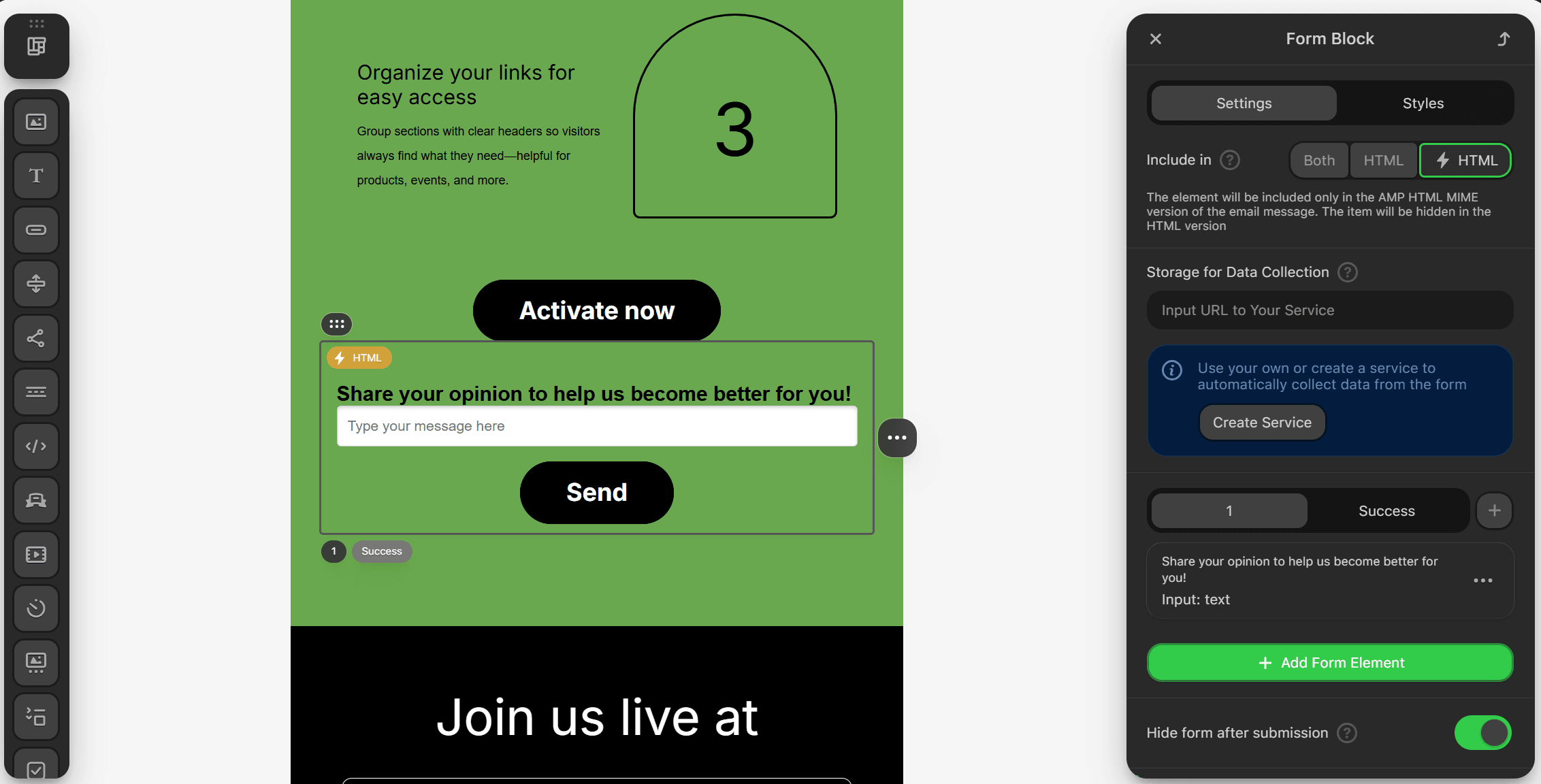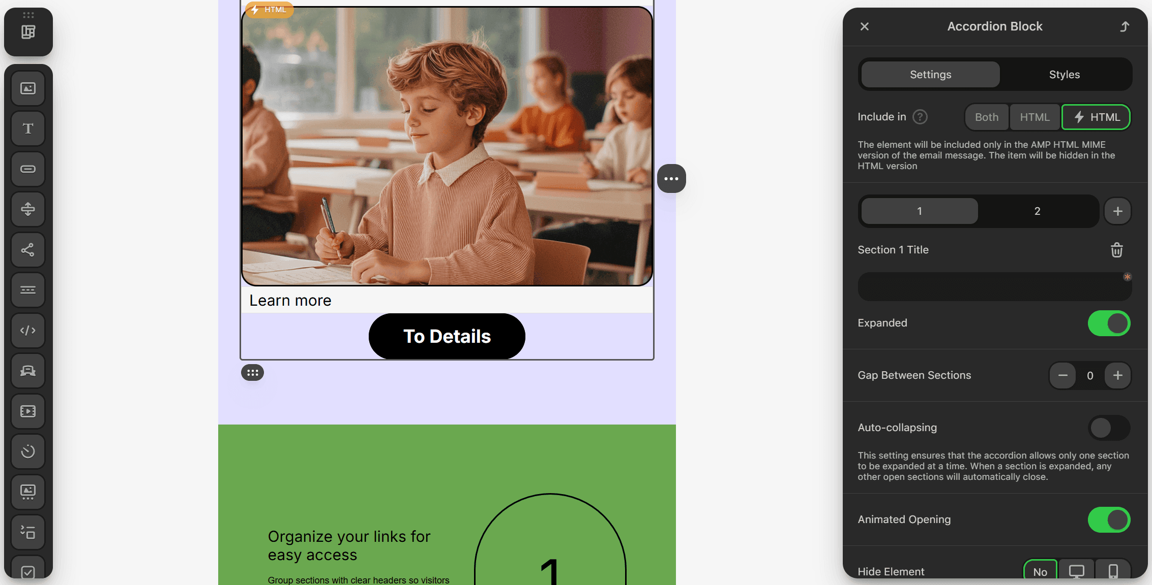 Stripo also supports AMP functionality. While working on a template, you can add Carousel, Form, or Accordion (blocks with text, images, or buttons that can be expanded by clicking) to your email.