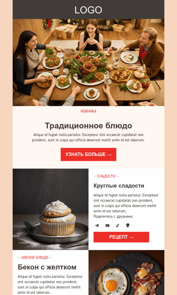 Яркий емейл-шаблон для рассылок к Международному женскому дню. Подходит туристическим компаниям, которые хотят рассказать о весенних турах и лучших вариантах отдыха. В письме можно разместить красочные фотографии направлений, специальные предложения и детали бронирования.