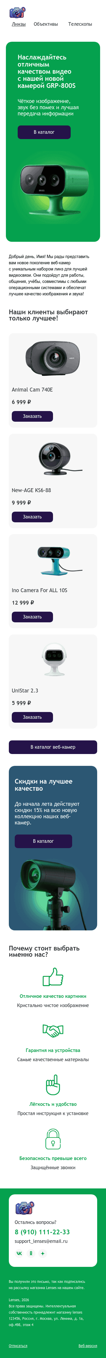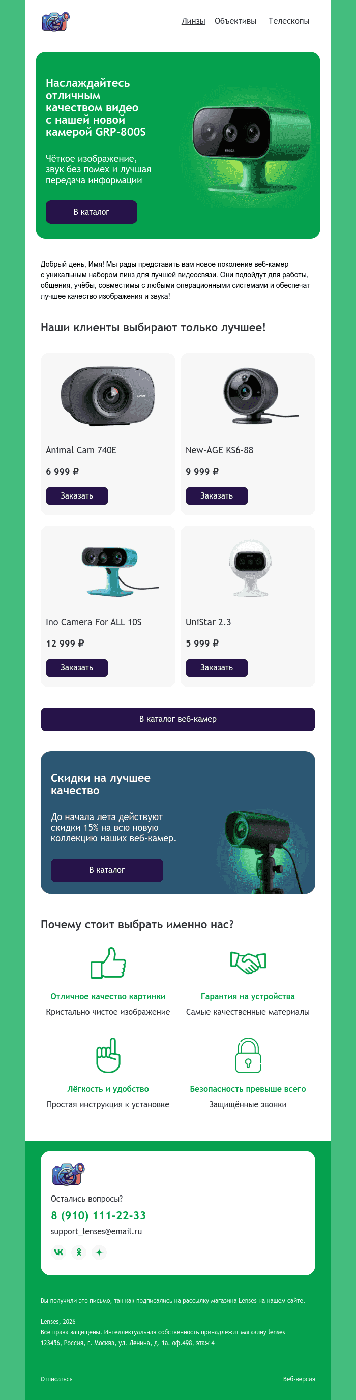 Этот email-шаблон подойдёт магазинам электроники, брендам компьютерной техники и компаниям, которые продают веб-камеры, аксессуары для видеосвязи и оборудование для онлайн-работы. Яркий баннер подчёркивает флагманский продукт и его преимущества, а карточки товаров с ценами и кнопками заказа, блок со скидочным предложением и секция с преимуществами бренда превращают шаблон в полноценную email-рассылку.