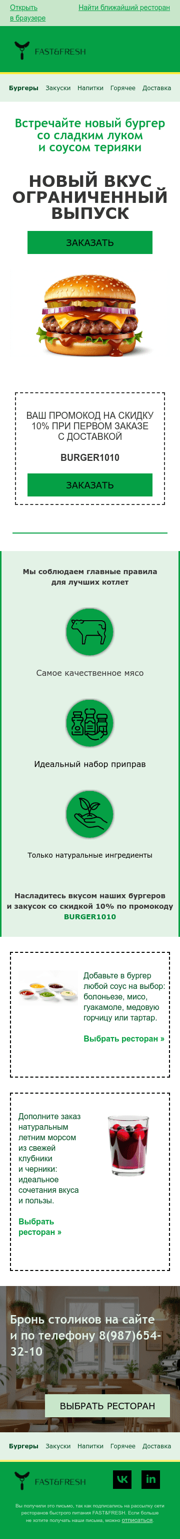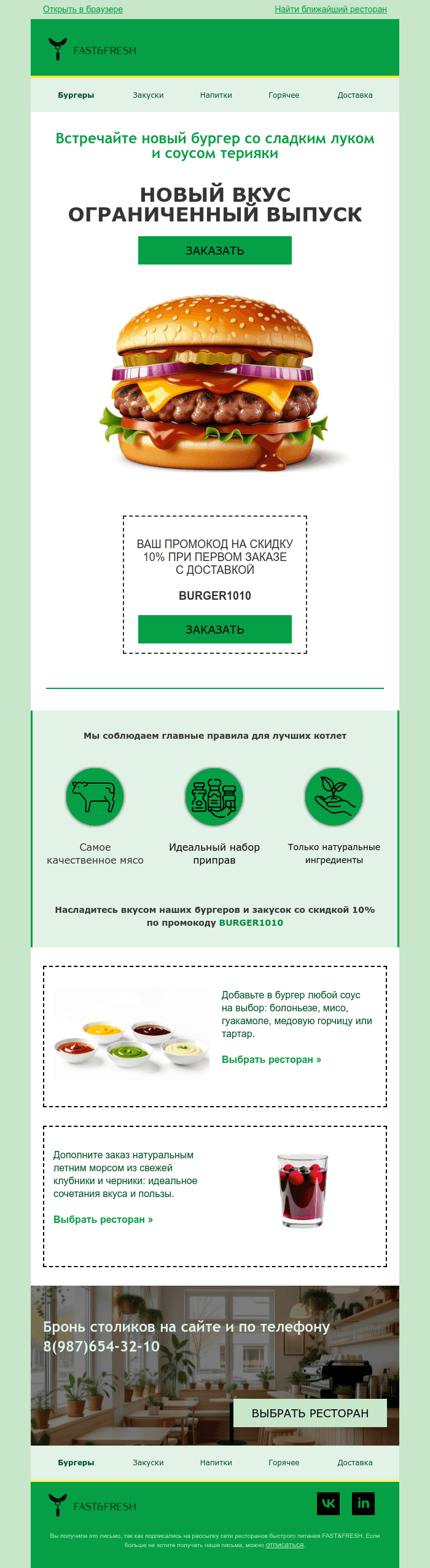 Шаблон подойдет для кафе или ресторана, который хочет сообщить об обновлении ассортимента и представить новое блюдо. В описании можно сделать акцент на новинке, добавить фото и выделить промокод со скидкой. Зеленые и белые тона создают свежий и аккуратный визуальный стиль, который хорошо подходит для гастрономической тематики.