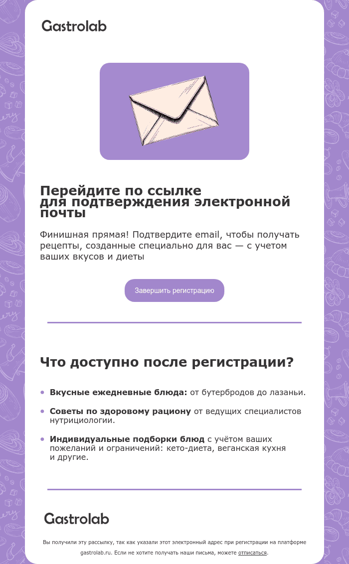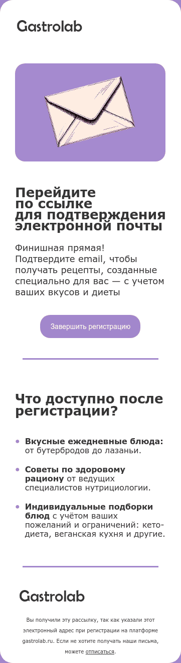 Этот емейл-шаблон подойдет для письма с подтверждением подписки после регистрации. Такое письмо можно использовать, чтобы подтвердить email пользователя и кратко рассказать, что станет доступно после создания аккаунта. Лаконичный дизайн в фиолетовых и белых тонах делает шаблон аккуратным, современным и понятным для первого контакта с подписчиком.