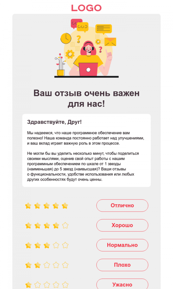 Все элементы письма можно легко настроить, обновляя текст, добавляя новые изображения и изменяя кнопки. Шаблон адаптируется под любые устройства, что обеспечивает корректное отображение как на мобильных, так и на компьютерах.