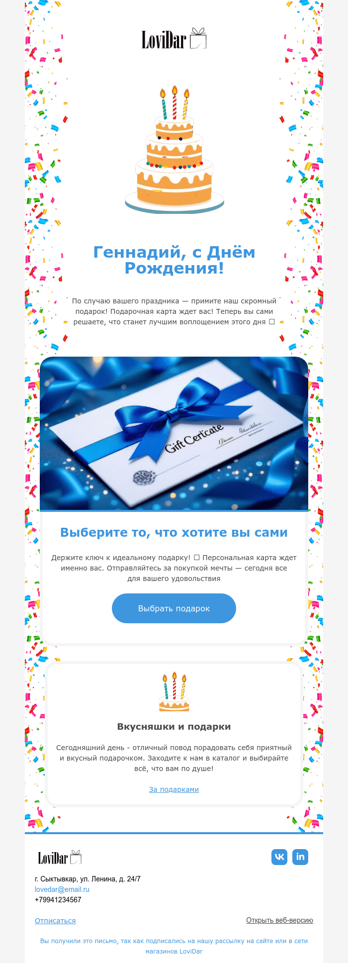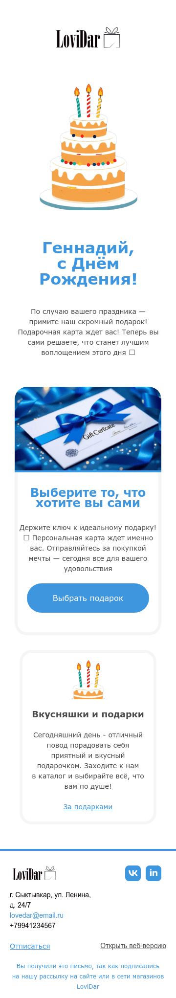 Лаконичный шаблон для письма ко дню рождения в белом оформлении. Подойдет для рассылки, в которой нужно поздравить получателя и сообщить о подарке в виде подарочной карты. Тематический акцент с тортом делает композицию уместной для праздничного письма.