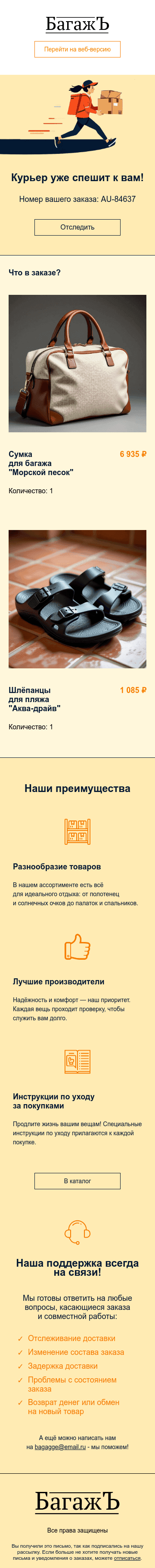 Спокойный емейл-шаблон в бежевых и оранжевых тонах для информационного письма о доставке. Подойдет для уведомления, в котором можно сообщить, что курьер уже спешит к получателю, и показать состав заказа. Приятное оформление делает email понятным и аккуратным, без лишней перегрузки.