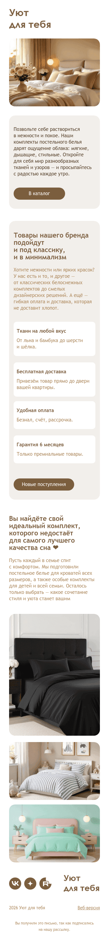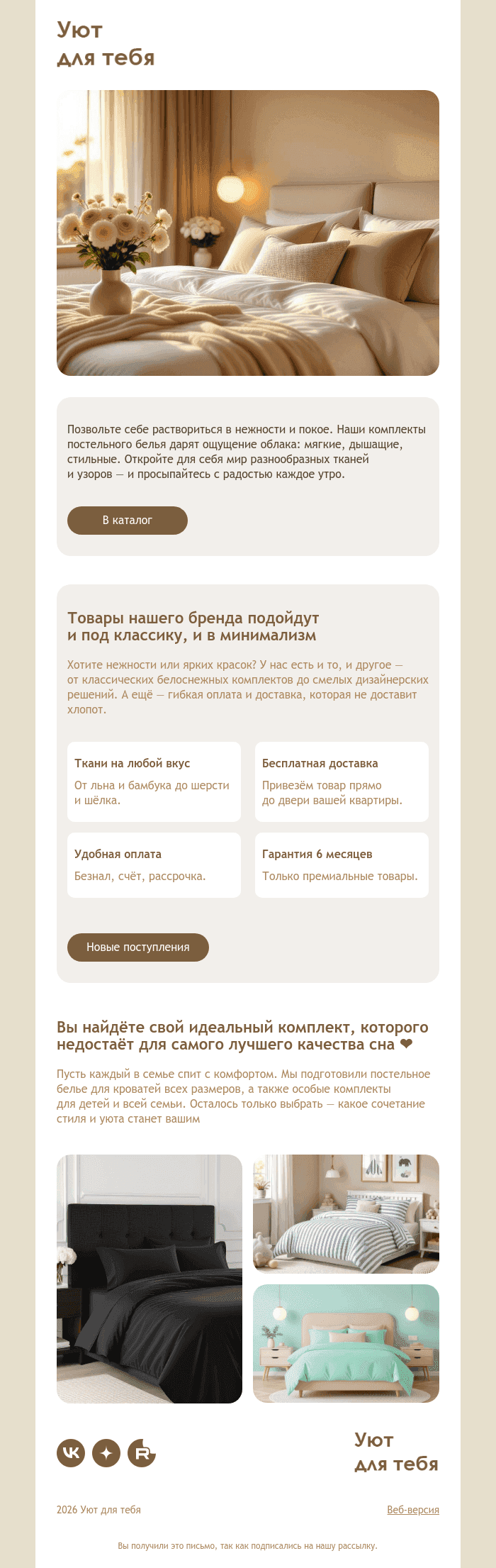 Email-шаблон в мягких цветах предназначен для магазинов и брендов домашнего текстиля, постельного белья и товаров для спальни. В письме предусмотрен крупный визуальный блок с интерьерной фотографией, секция с преимуществами бренда и блок с галереей товаров, где можно показать разные варианты комплектов.
