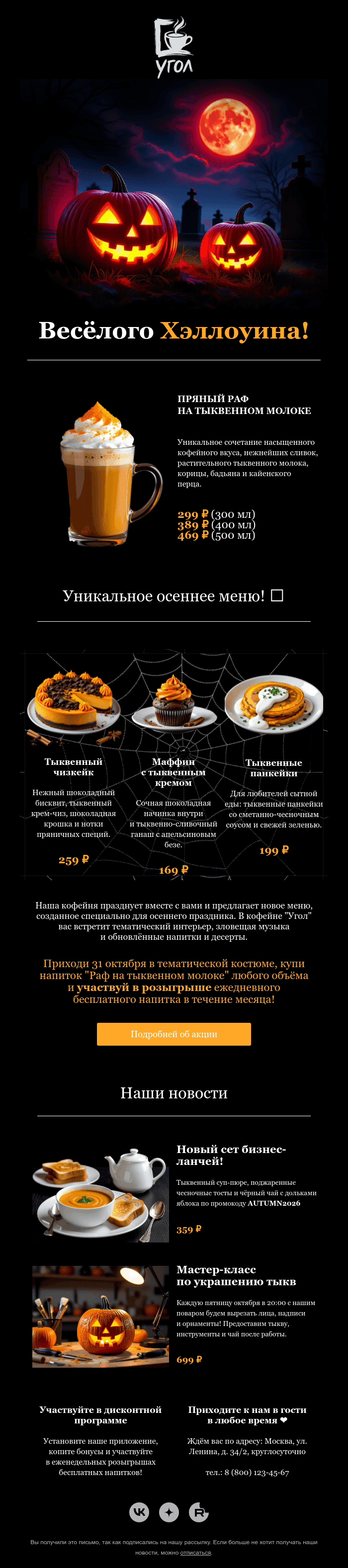 Емейл-шаблон подходит для сезонной рассылки к Хэллоуину или другой тематической акции в кафе, ресторане и кондитерской. Письмо позволяет анонсировать специальное меню, рассказать о новых напитках и десертах, пригласить гостей на мастер-классы или предложить участие в праздничной акции.