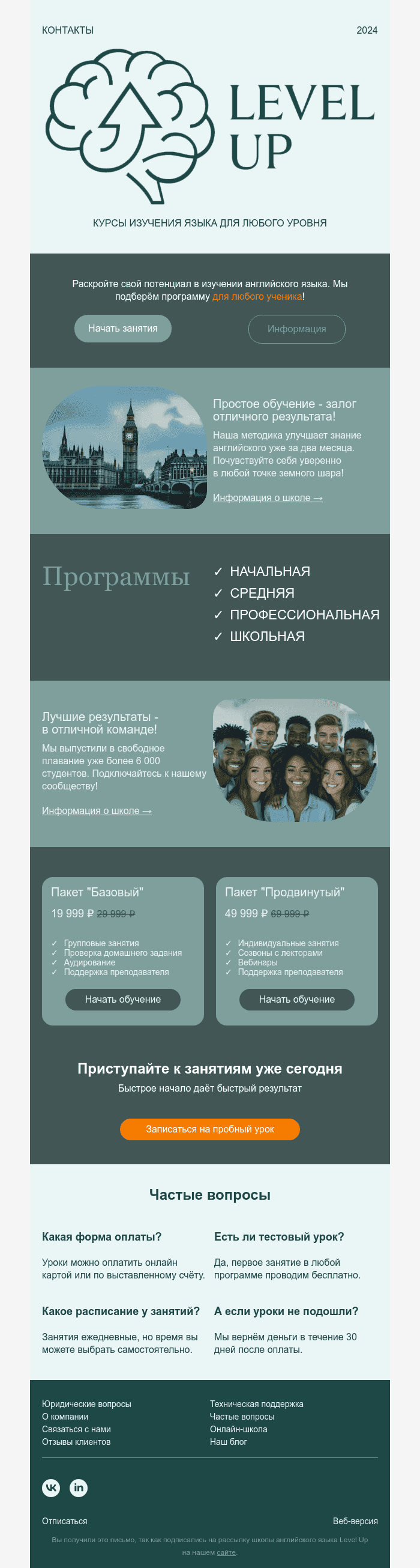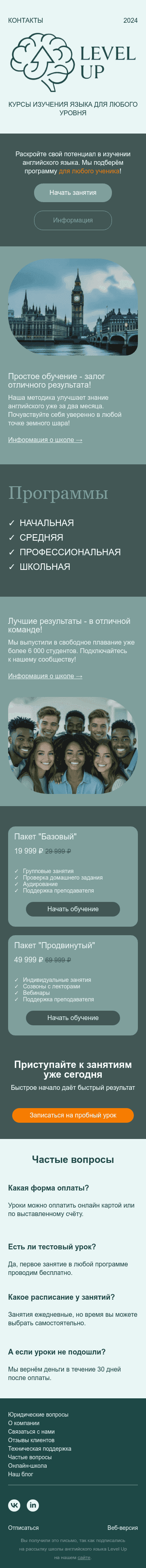 Email-шаблон в лаконичном дизайне подойдёт для языковых школ, образовательных центров и онлайн-платформ. В письме можно перечислить учебные программы разных уровней, рассказать о формате занятий и предложить запись на пробный урок. Отдельно предусмотрены блоки с тарифными пакетами и секция с ответами на частые вопросы.