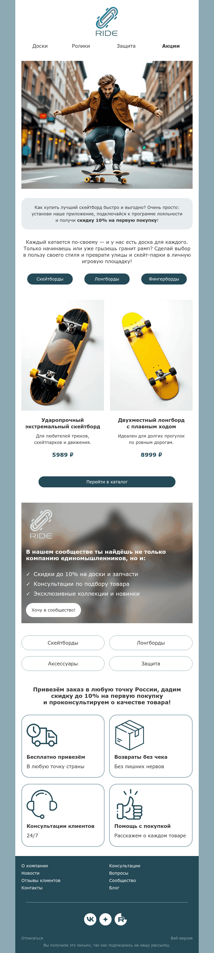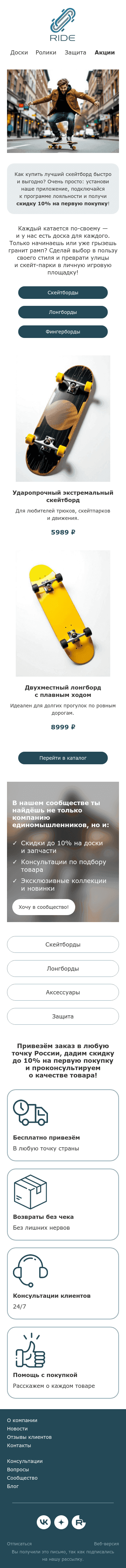 Визуального конструктора писем PixcraftЕмейл-шаблон магазина скейтбордов и других спортивных товаров