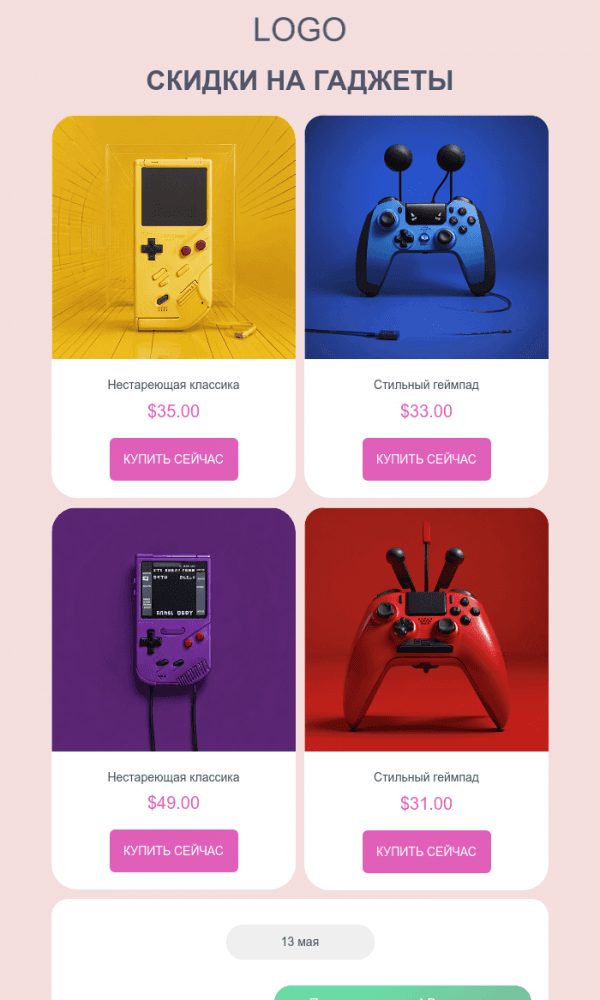 Этот емейл-шаблон создан для рассылок, приуроченных к пятнице 13-го. Письмо оформлено в стиле акции с подборкой из 13 товаров со скидками. В карточках можно разместить мебель или любые другие товары: описания, фото, старую и новую цену, кнопку для быстрого заказа.