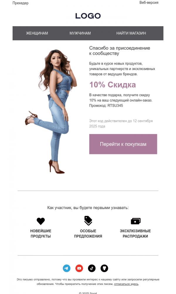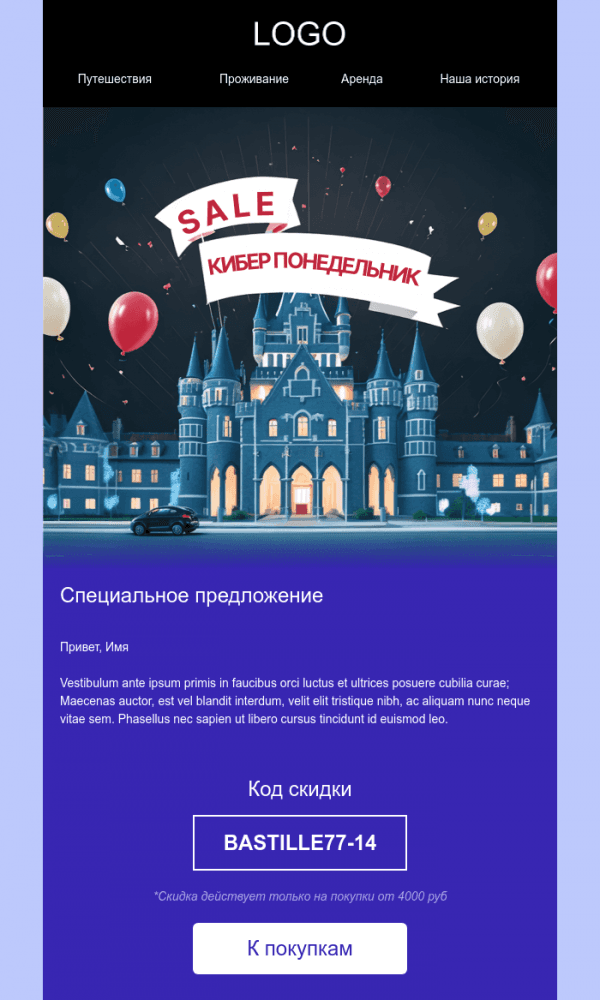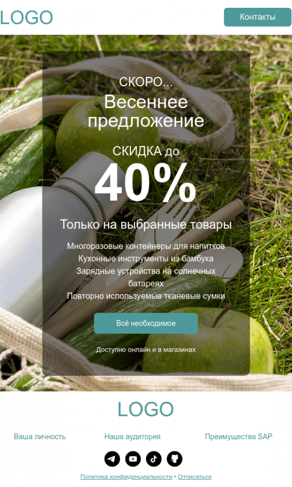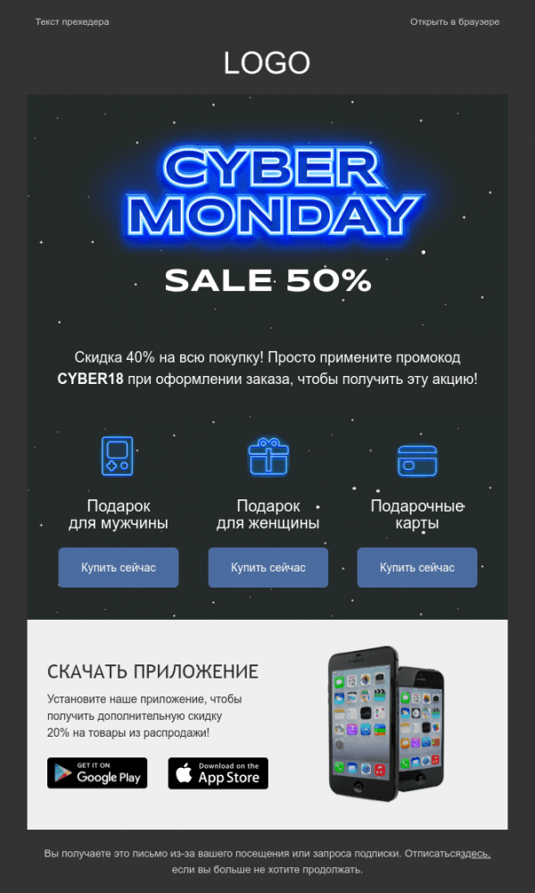 Шаблон адаптивный, хорошо читается с телефона и компьютера. Все тексты, фото и кнопки меняются без сложной верстки — прямо в конструкторе. Готовое письмо можно сохранить в HTML, AMP, ZIP с картинками или EML и использовать для рассылки в любой системе.