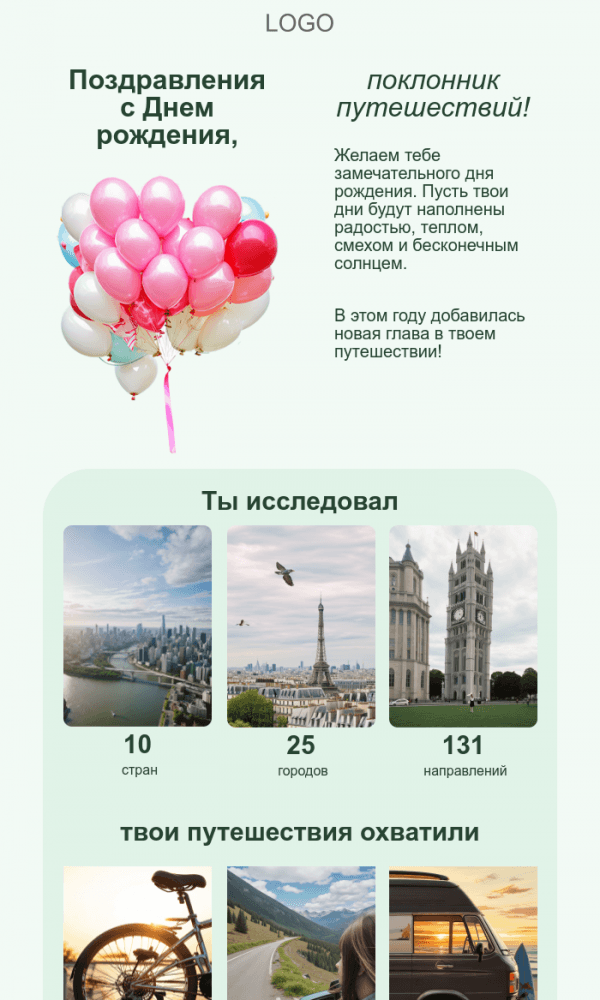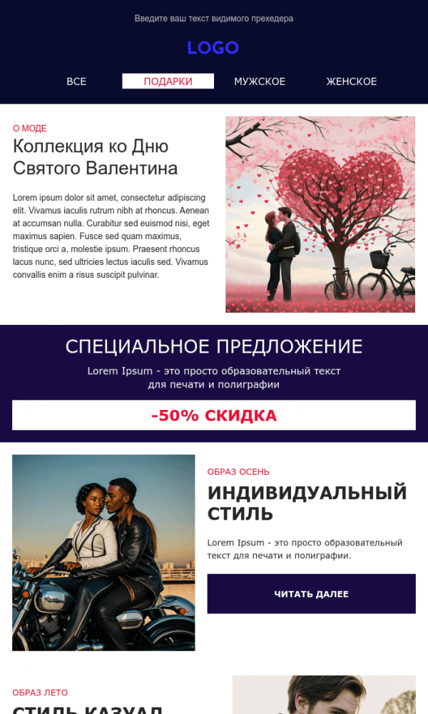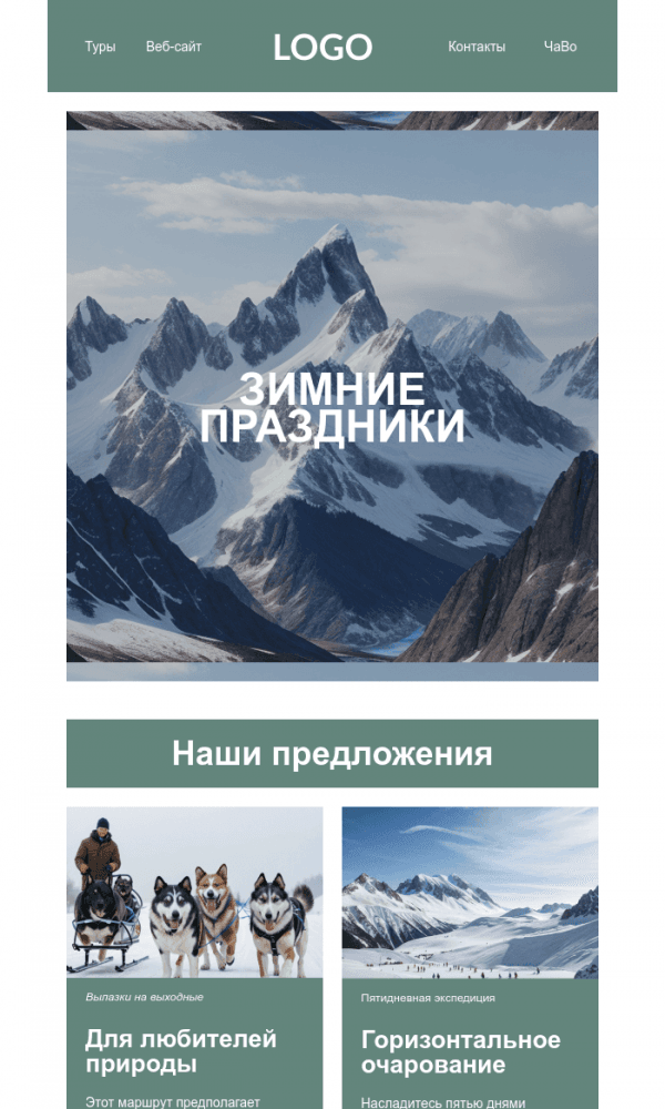 Шаблон для рассылки, посвященный Дню святого Валентина, оформленный в ярких и праздничных тонах. В письме представлены туры, идеально подходящие для романтического отдыха. Указана информация о каждом туре, его особенностях, а также цены.
