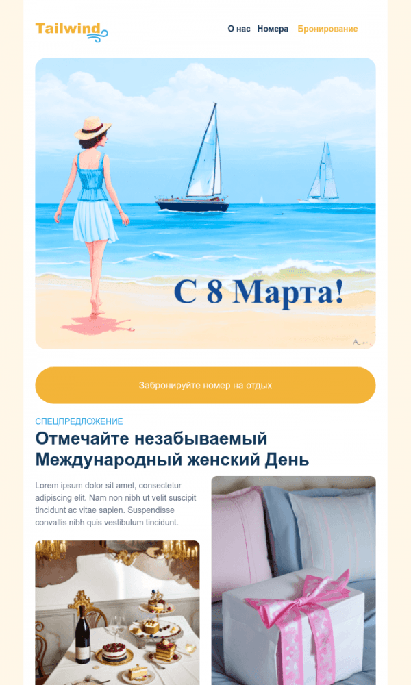 Все элементы письма можно легко настроить: редактировать текст, загружать новые изображения и настраивать кнопки. Шаблон адаптируется под различные устройства и будет выглядеть аккуратно как на мобильных, так и на настольных компьютерах.