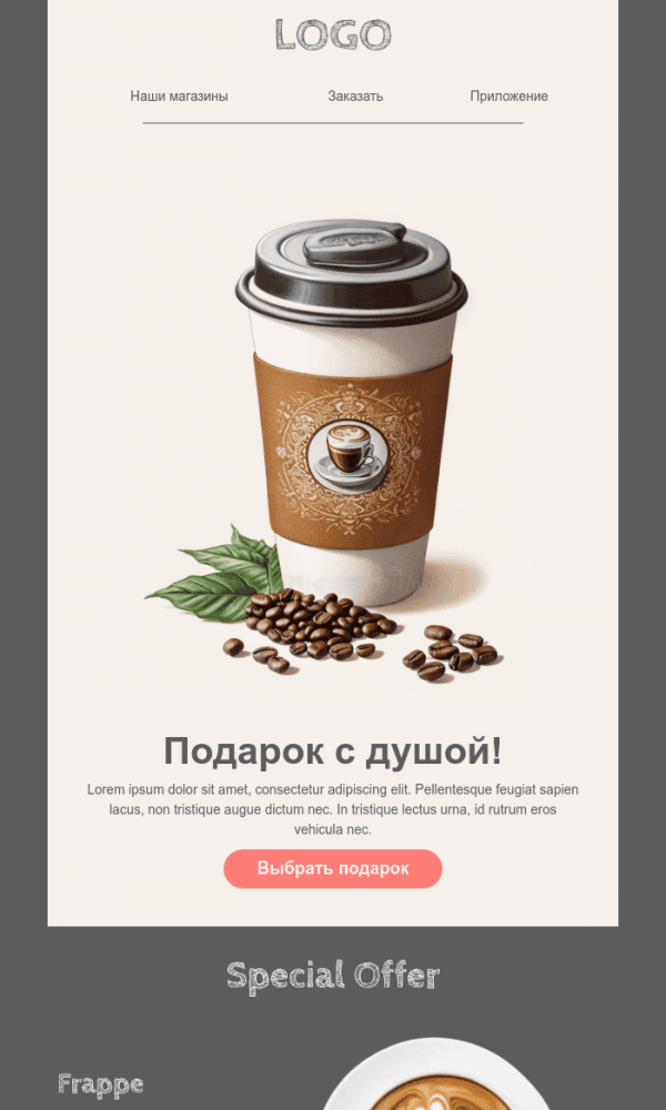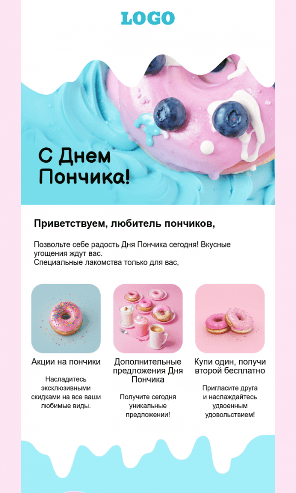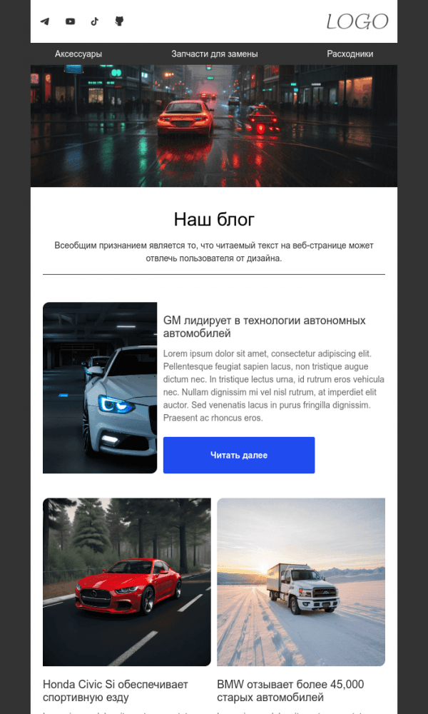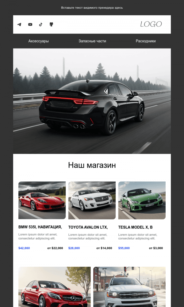 Этот шаблон идеально подходит для кондитерских или магазинов тортов. В письме представлены карточки товаров с фотографиями и краткими описаниями. Стиль минималистичен, с белым фоном, чтобы акцент был на самих тортах.