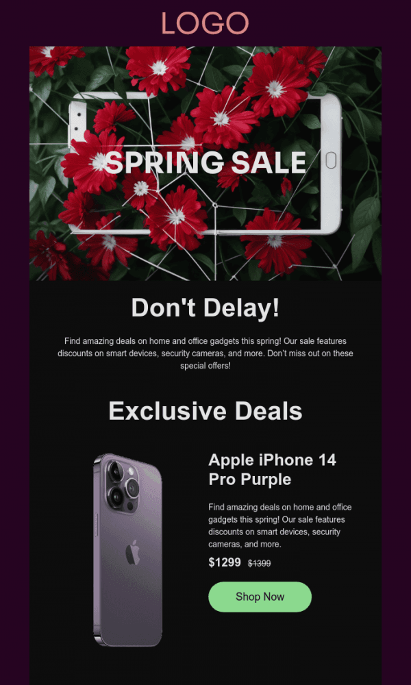 The template is easy to customize and looks great on both mobile devices and desktops. All elements — text, images, and buttons — can be edited directly in the browser. After customization, the layout can be downloaded in HTML, AMP, ZIP (with images), or EML formats and sent through any email marketing service.