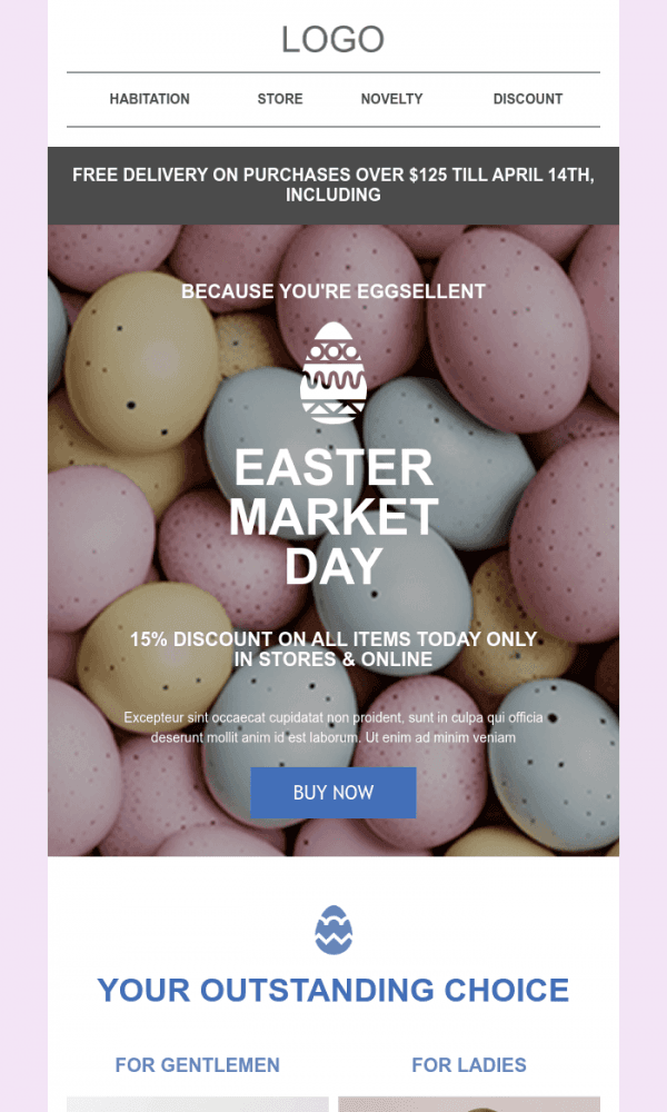A template for an Easter newsletter, where you can include a music playlist for the holiday. The email also has space for a video. The design is done in purple tones, which adds style and a festive mood to the message.
