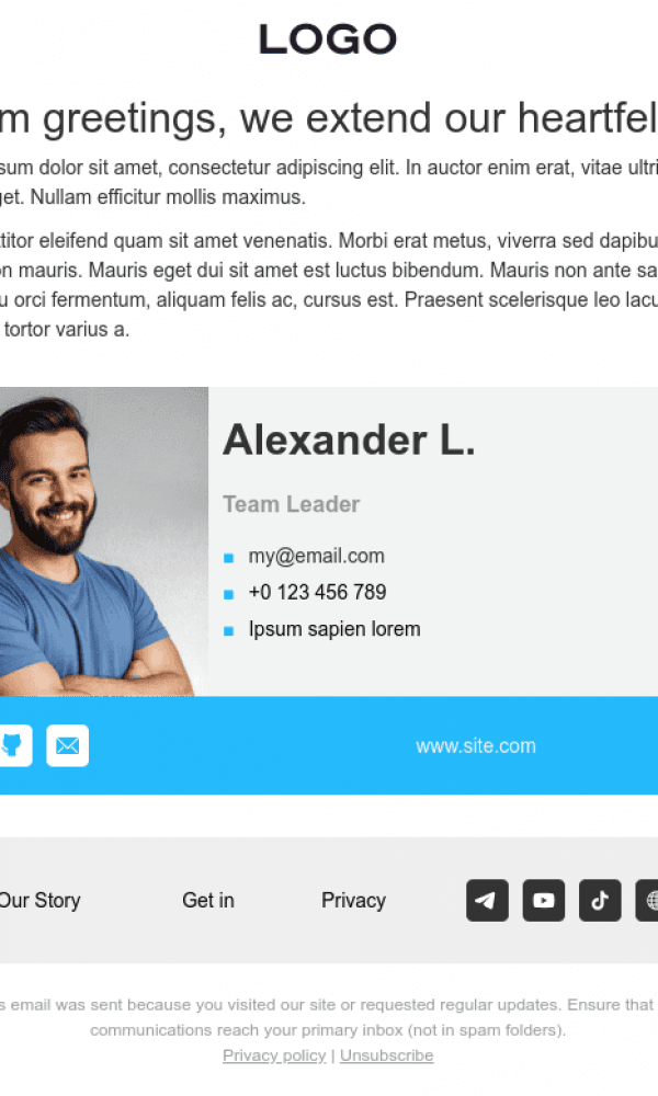 The email is responsive and easy to read on any device. It can be quickly edited in an online builder. The final layout can be exported in HTML, AMP, ZIP with images, or EML format for Outlook, and connected to any email marketing service through built-in integrations.