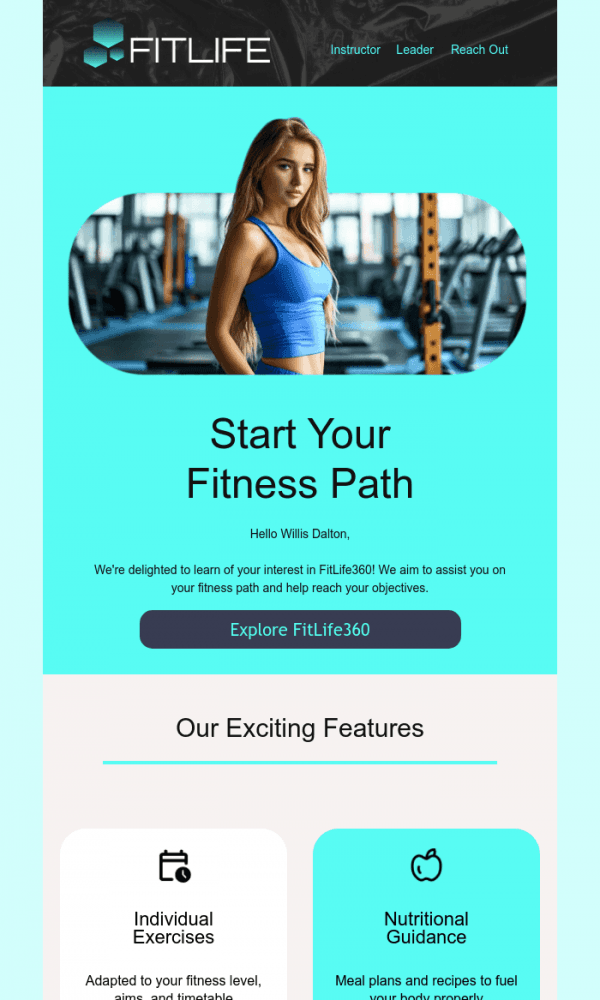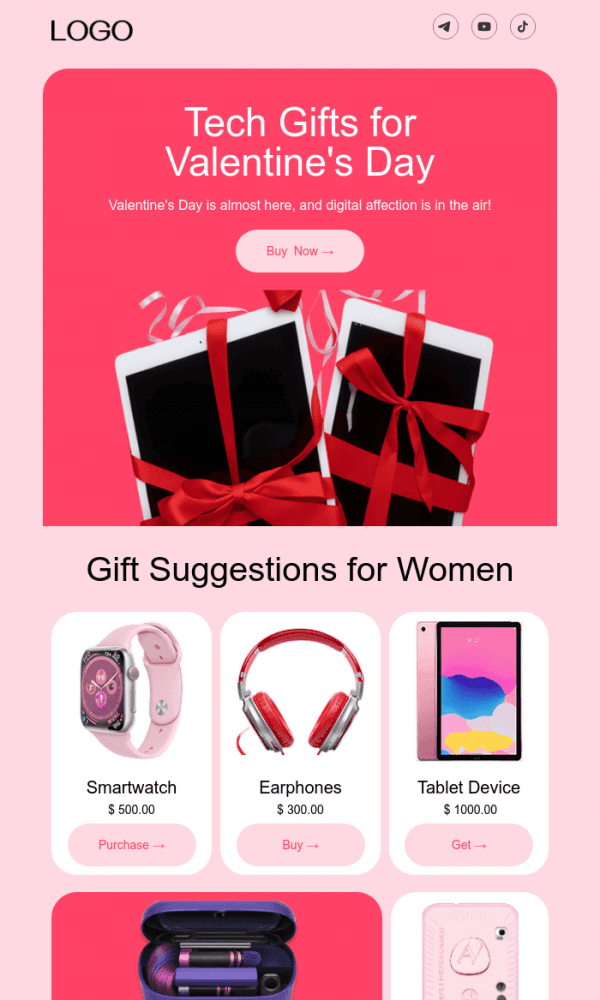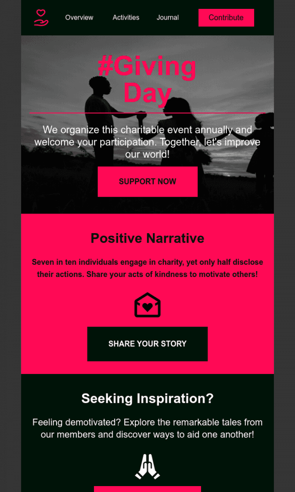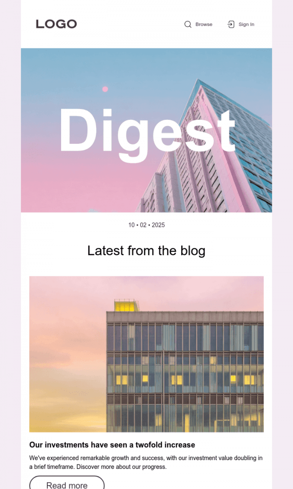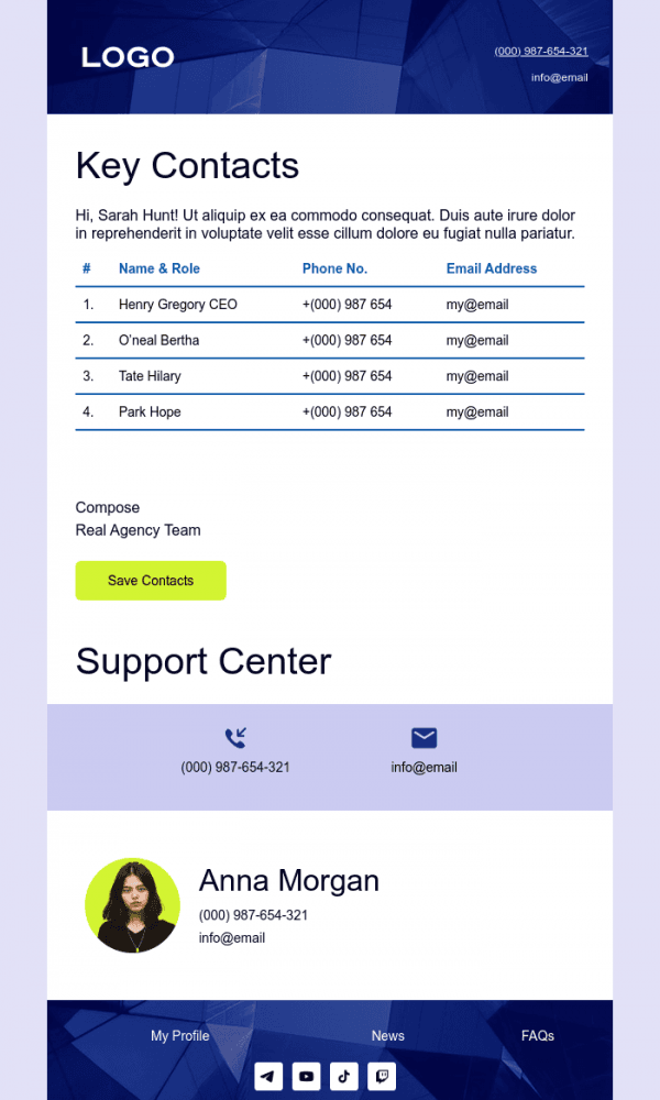 The email displays well on any device. Everything is easy to customize—texts, images, and buttons. The finished version can be saved in the desired format and sent through any email marketing platform.