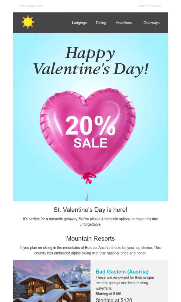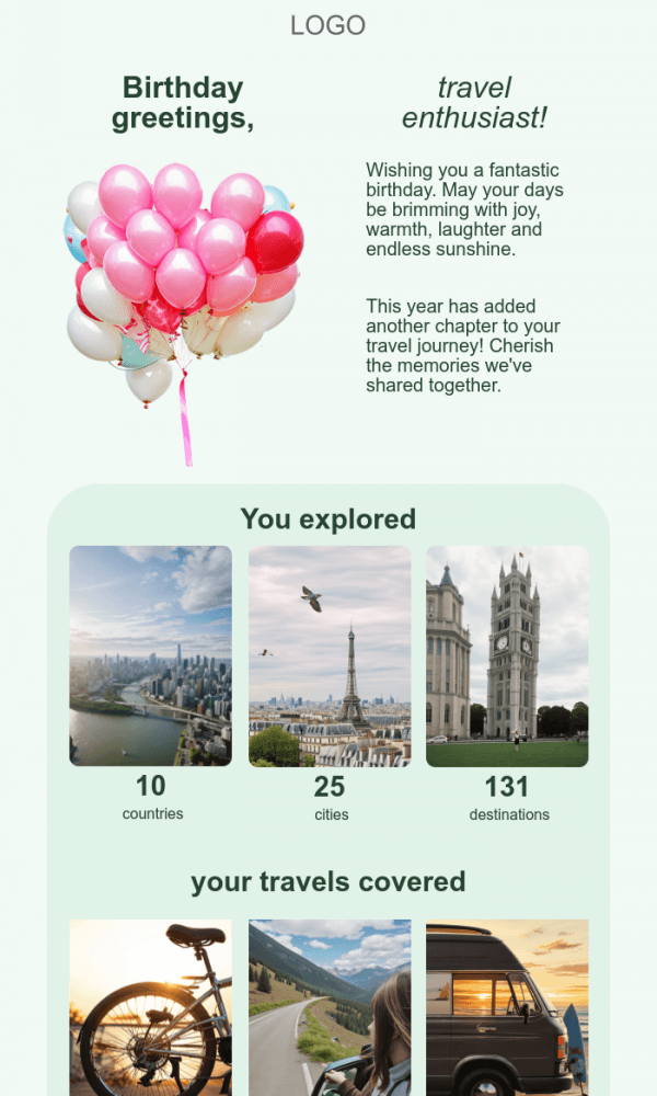 A vibrant email template for International Women’s Day campaigns. Perfect for travel companies that want to showcase spring tours and the best vacation options. The email can include colorful photos of destinations, special offers, and booking details.