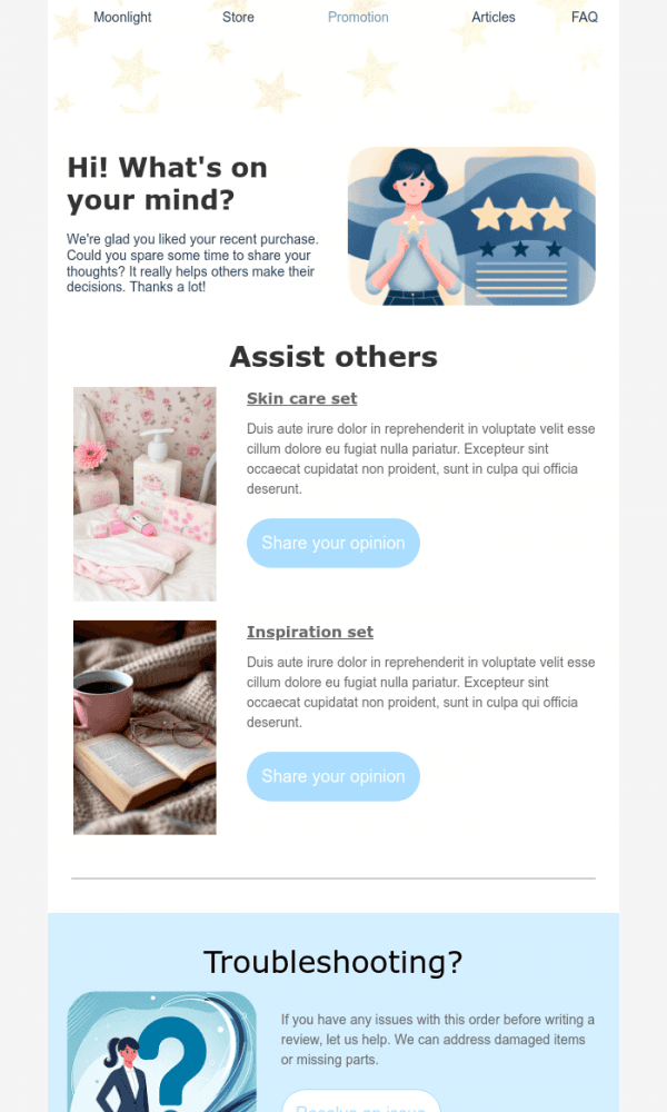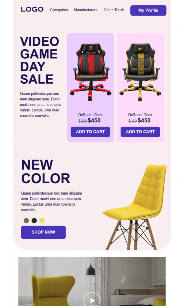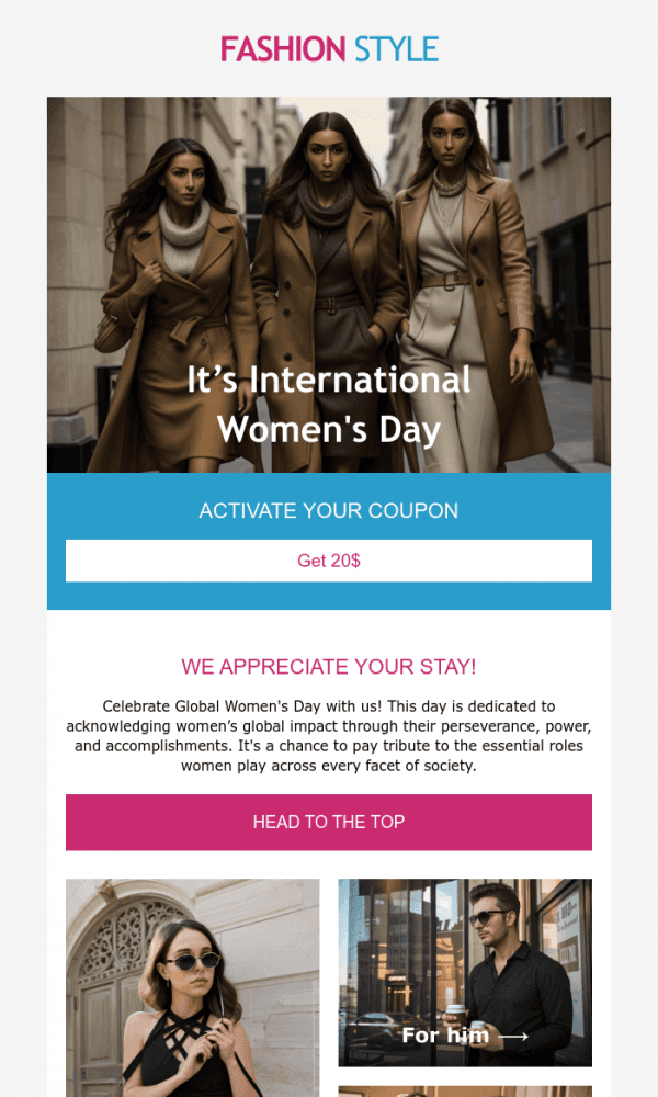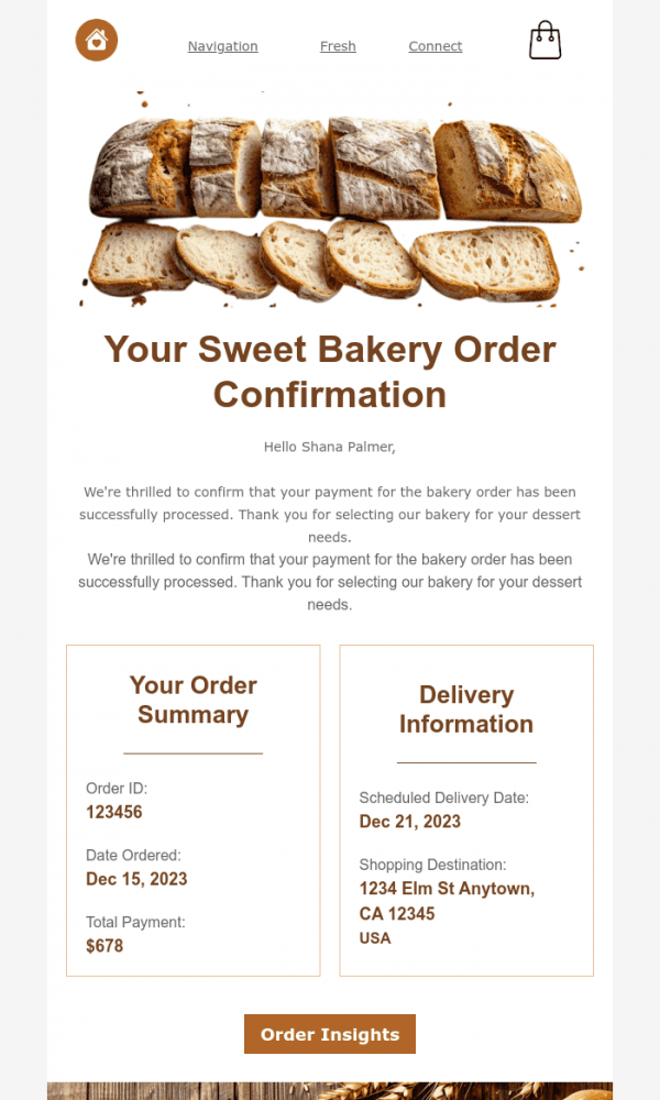 This template is perfect for confirming orders in an online store. It displays order details, including a list of purchased items and customer information. At the bottom, there are clickable product categories that allow the customer to easily navigate to other sections of the store. The template not only confirms the purchase but also directs the customer to additional products, increasing the chances of repeat purchases.